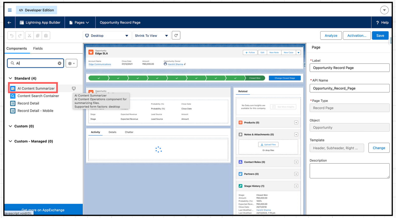 Salesforce introduced a new component called “AI Content Summarizer” in the Summer ’26 release, and users can now access it while editing a Lightning record page to enhance productivity as its features roll out.