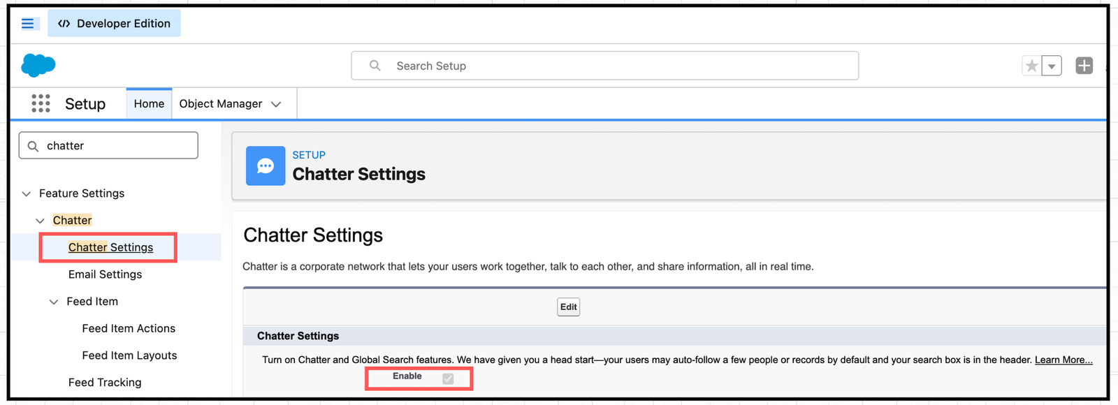 Starting with the Summer ’26 release, Salesforce changes the default Chatter setting so it no longer enables automatically. You now need to turn it on manually by going to Setup and navigating to Chatter Settings.