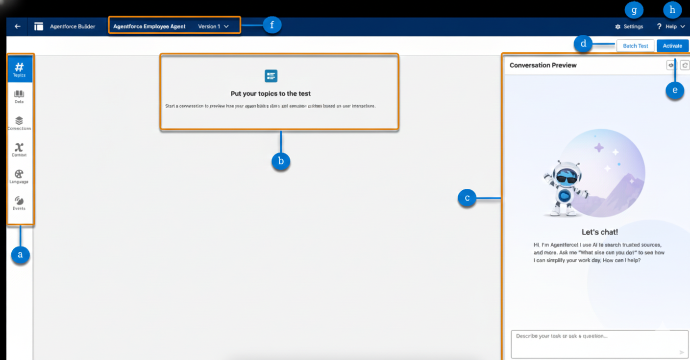Agentforce Builder is a single workspace made up of clearly defined sections. Each one exists to solve a specific control or trust concern.