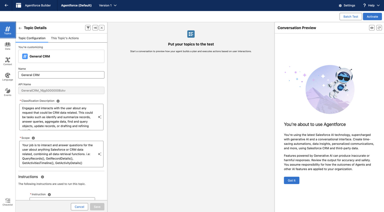 When you open Agentforce Builder, everything is out in the open. Configuration sits on the left, reasoning is visible in the center, and testing happens right alongside it.